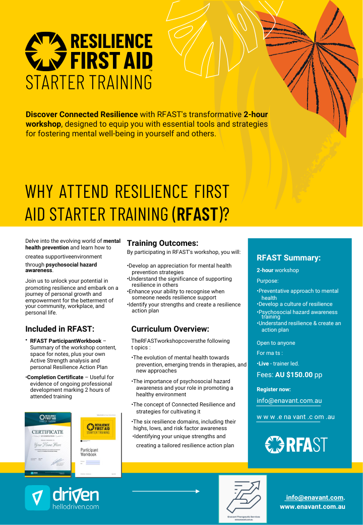 Enavant Therapeutic Services is grateful that there has been a DONATION for several participants to attend Resilience First Aid Starter Training in the future at a reduced participant fee. Please email: [email protected] for further information about the selection criteria.