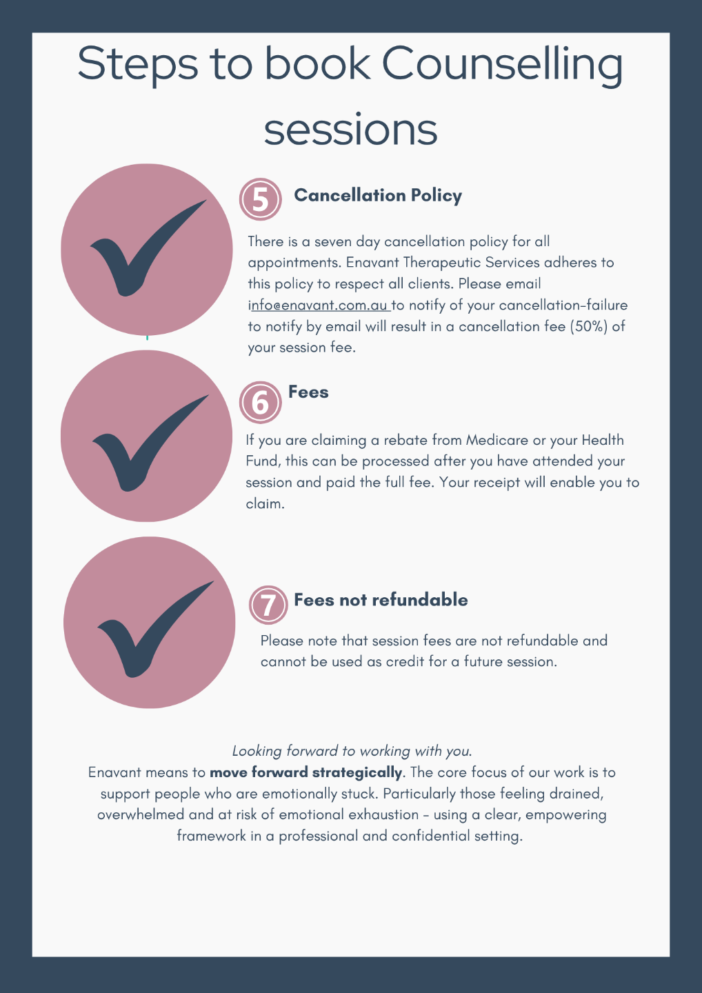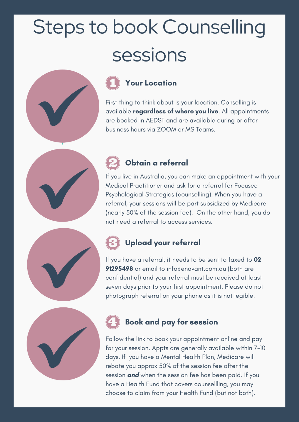 You will receive an email with a link to join the session 24 hours before your appointment time. Please ensure you are in a confidential and quiet setting for your counselling session.Ā