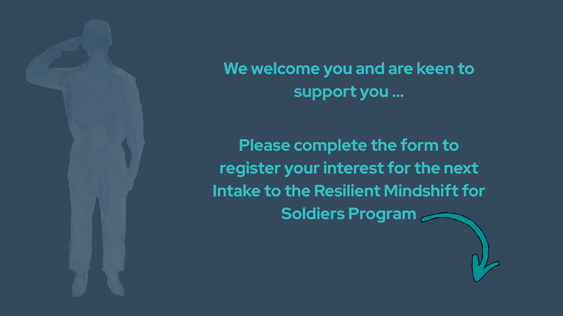 In the early stages of the Resilient Mindshift for Soldiers Program, you may participate in a few questions that will generate a short report to help us focus on the main areas that would be beneficial for you - you will receive a copy of the report.