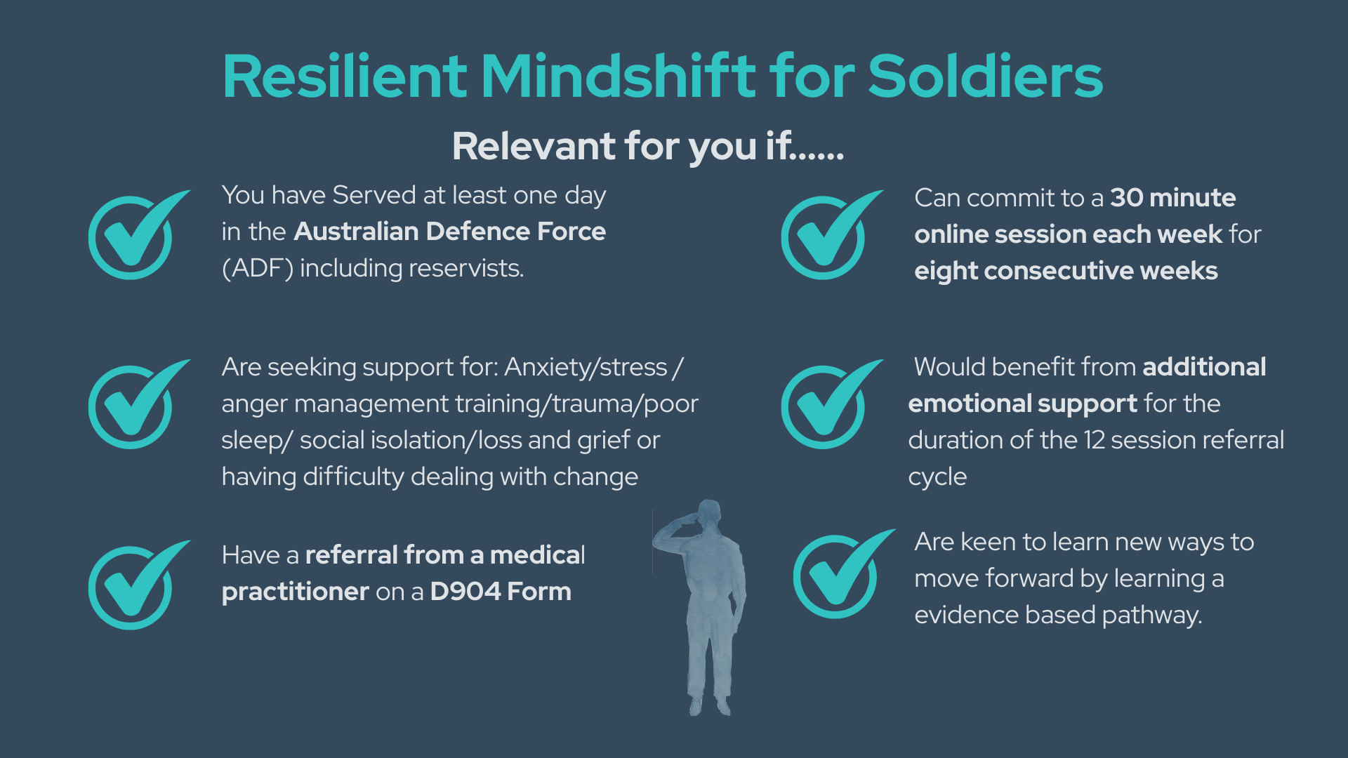 Participation in the Resilient Mindshift for Soldiers Program is subsidied by DVA which means that if you have served at least one day in the ADF (and) have a referral from your Medical Practitioner, there is no cost to you.